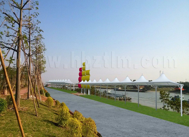 膜材采用PVDF國產(chǎn)或者進口建筑膜材、PTFE玻璃纖維建筑膜材、ETFE透明的永久性建筑膜材;自動放樣裁剪,高頻焊接,拉伸效果超強,曲線成型可千變萬化;膜材質保一般可達15-20年。