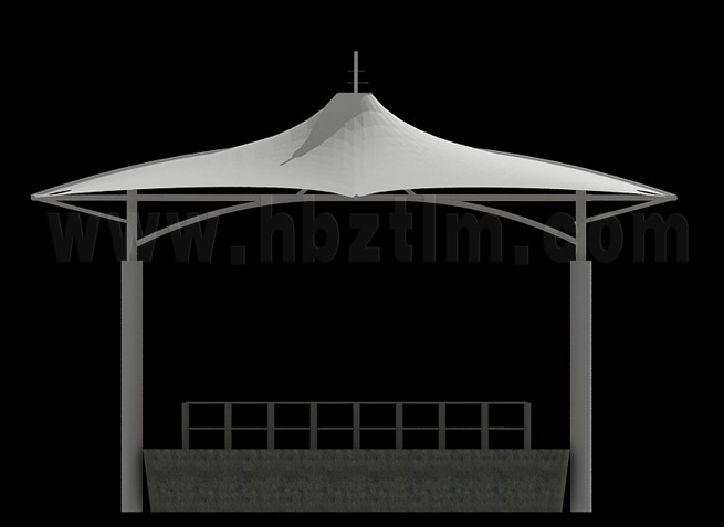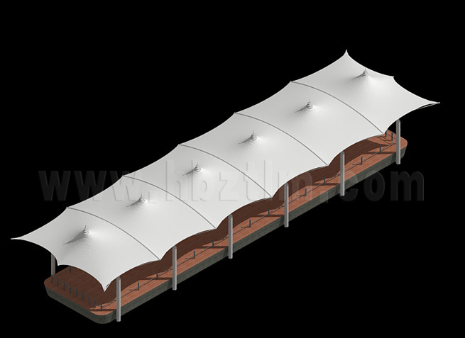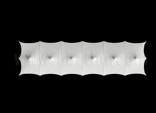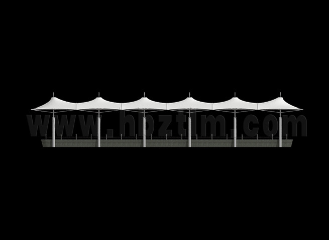 膜材采用PVDF國產或者進口建筑膜材、PTFE玻璃纖維建筑膜材、ETFE透明的永久性建筑膜材;自動放樣裁剪,高頻焊接,拉伸效果超強,曲線成型可千變萬化;膜材質保一般可達15-20年。
