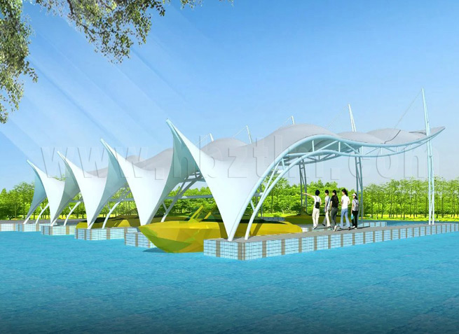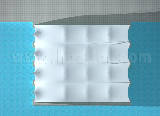 膜材采用PVDF國產(chǎn)或者進口建筑膜材、PTFE玻璃纖維建筑膜材、ETFE透明的永久性建筑膜材;自動放樣裁剪,高頻焊接,拉伸效果超強,曲線成型可千變?nèi)f化;膜材質(zhì)保一般可達15-20年。