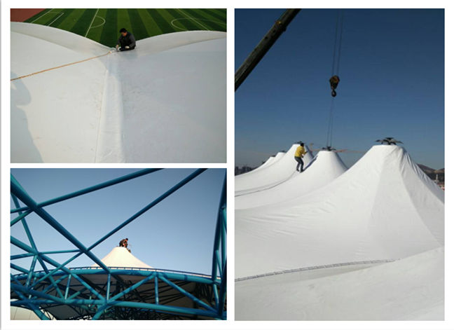 圖3 遼寧財(cái)貿(mào)學(xué)院體育看臺(tái)膜結(jié)構(gòu)拉膜現(xiàn)場(chǎng)施工照片