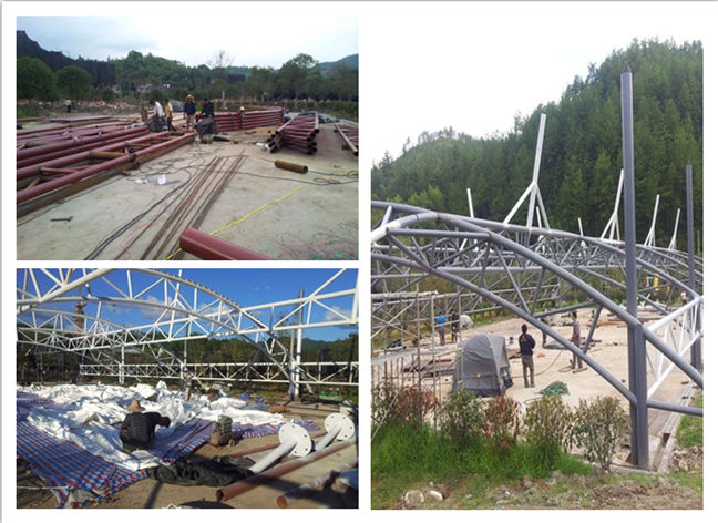 圖1 江西南昌風(fēng)景區(qū)網(wǎng)球場(chǎng)頂棚膜結(jié)構(gòu)鋼結(jié)構(gòu)現(xiàn)場(chǎng)施工圖