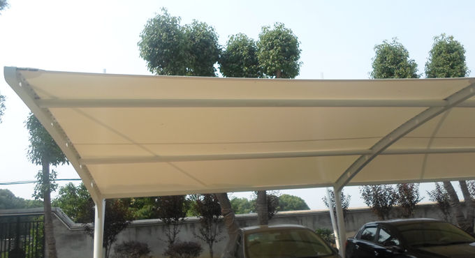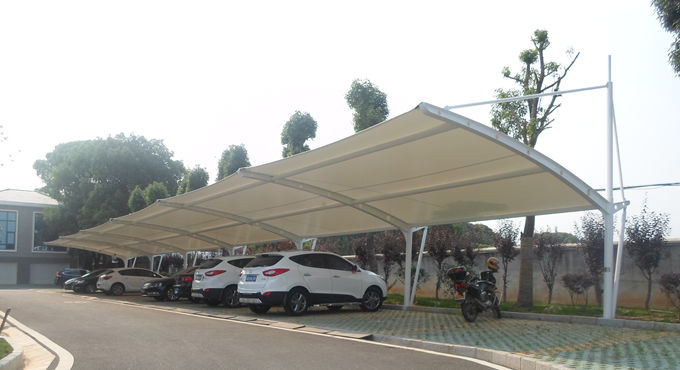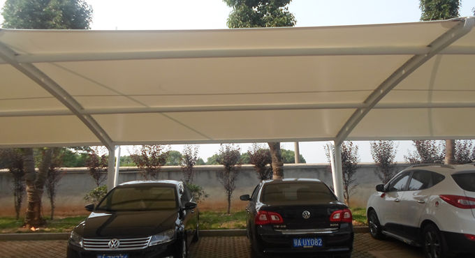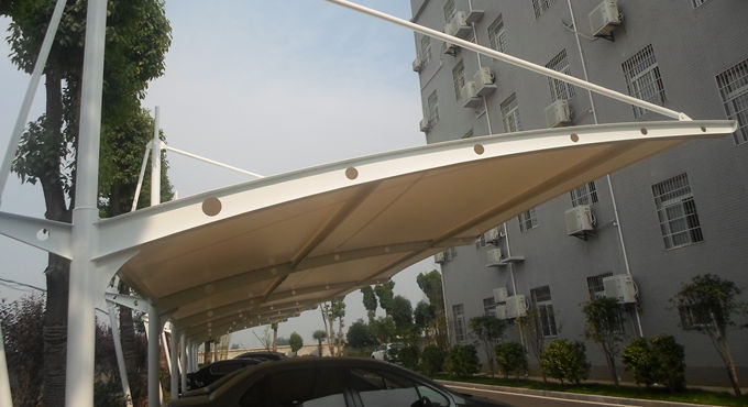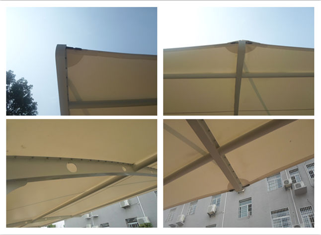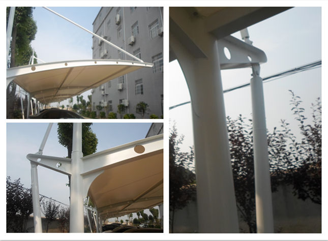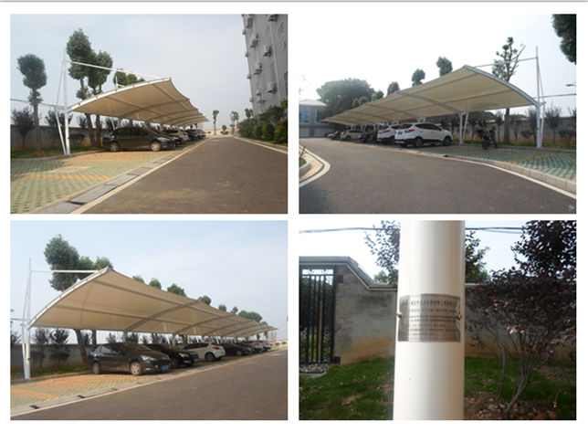 黃陂祁家灣鎮(zhèn)吊塔式異型鋼膜結構車棚,本項目采用前軟邊后硬邊張拉形式;結構由立柱、拉桿、挑梁、橫桿構成,其挑梁和中間橫桿一般采用異形鋼挑梁形式,美觀而不積水且抗負荷能力強;膜材采用PVDF白色車棚專用建筑膜材,15年質保,整體結構美觀實用,經濟牢固,臻至完美。