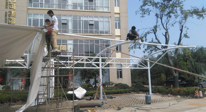 圖2 卓爾T型圓管膜結構車棚拉膜現場施工圖