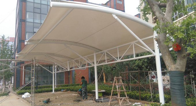 盤龍城卓爾社區(qū)T型圓管膜結構車棚,本項目采用前軟邊后硬邊張拉形式;結構由立柱、拉桿、挑梁、橫桿構成,其挑梁和中間橫桿采用弧型圓管挑梁形式,美觀而不積水且抗負荷能力強;膜材采用PVDF白色車棚專用建筑膜材,15年質保,整體結構美觀實用,經濟牢固,臻至完美。