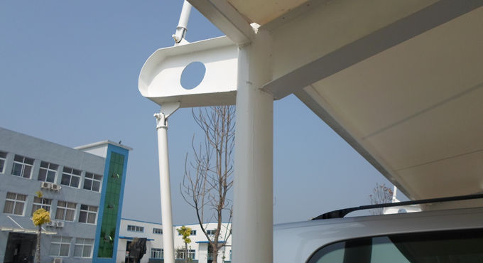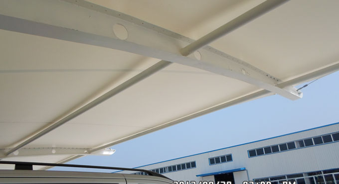 湖北凱騎公司吊塔式異形鋼膜結(jié)構(gòu)車棚,本項(xiàng)目采用前軟邊后硬邊張拉形式;結(jié)構(gòu)由立柱、拉桿、挑梁、橫桿構(gòu)成,其挑梁和中間橫桿一般采用異形鋼挑梁形式,美觀而不積水且抗負(fù)荷能力強(qiáng);膜材采用ZZF白色建筑膜材,15年質(zhì)保,整體結(jié)構(gòu)美觀實(shí)用,經(jīng)濟(jì)牢固,臻至完美。