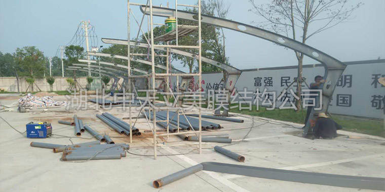 現(xiàn)在工程施工人員正在現(xiàn)場拉膜中,此時(shí)膜結(jié)構(gòu)車棚已經(jīng)快完工了,只有幾片片膜材沒有拉上去了。