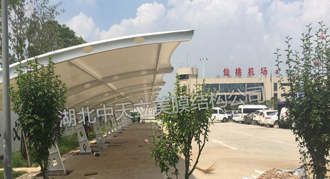 仙桃機(jī)場是全國第一家標(biāo)準(zhǔn)化通用航空機(jī)場,是國網(wǎng)通用航空公司三大區(qū)域中心基地之一;這次選擇與中天立美膜結(jié)構(gòu)公司合作膜結(jié)構(gòu)車棚項(xiàng)目,本次膜結(jié)構(gòu)車棚項(xiàng)目共兩處地方施工,一個(gè)膜結(jié)構(gòu)小車車棚,一個(gè)膜結(jié)構(gòu)自行車棚;該項(xiàng)目膜材采用PVDF建筑膜材,膜材自潔性高,經(jīng)久耐用。