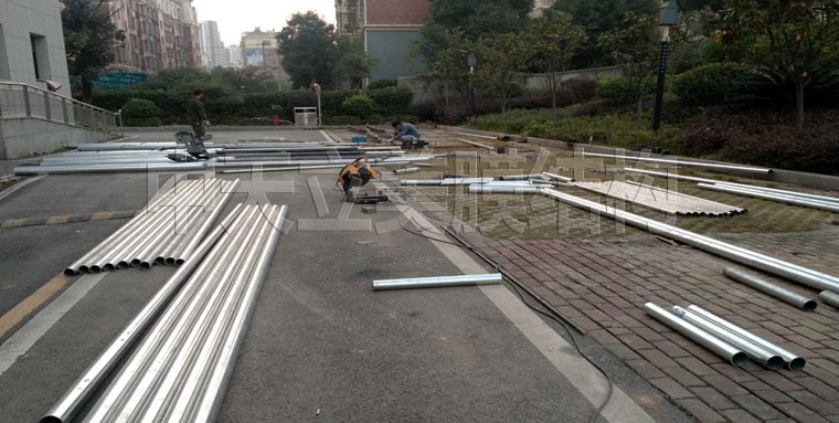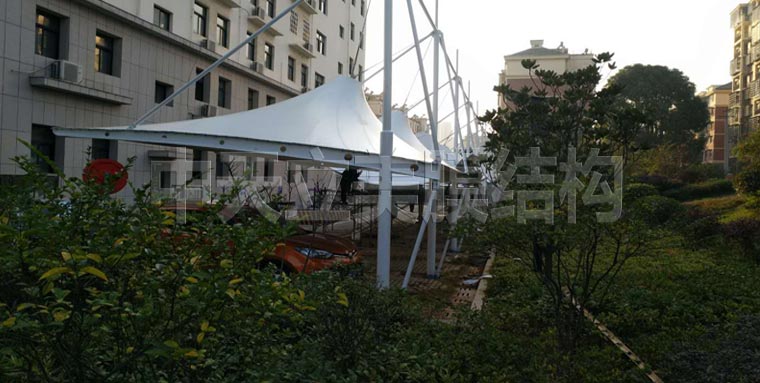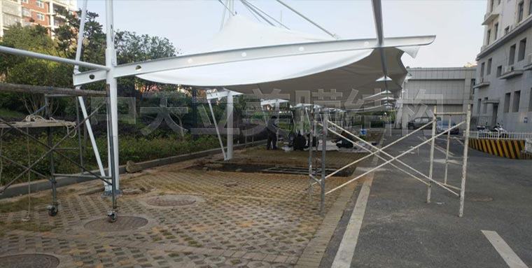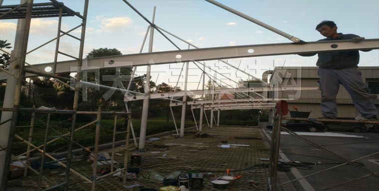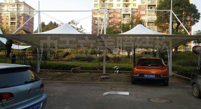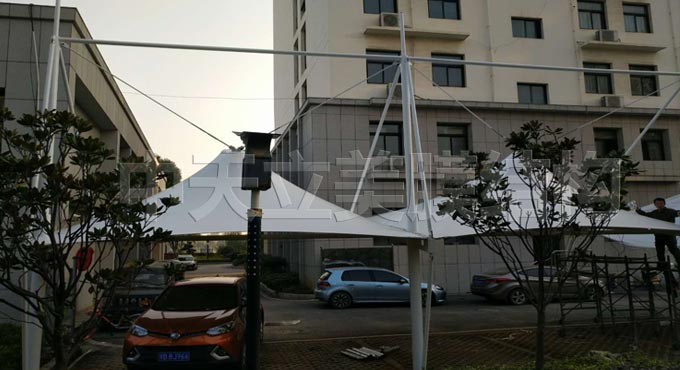 已拉好部分膜結(jié)構(gòu)車(chē)棚細(xì)節(jié)展示,車(chē)棚側(cè)面及背面細(xì)圖片展示可以更直觀的了解帽頂式車(chē)棚樣式。