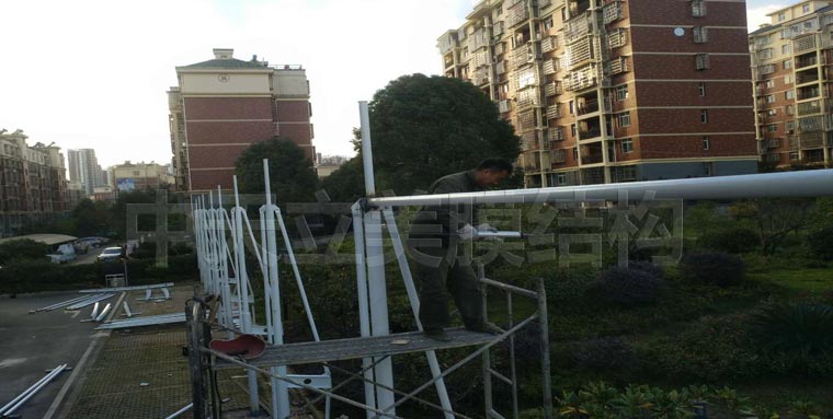 經(jīng)過(guò)十多天平穩(wěn)施工,現(xiàn)在已經(jīng)開(kāi)始拉膜,帽頂式結(jié)構(gòu)車(chē)棚拉膜會(huì)比較緩慢一些,要一個(gè)個(gè)帽頂安裝上去。