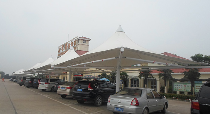 G4高速湖北孝感景觀停車棚膜結(jié)構(gòu),該項(xiàng)目為景觀性停車棚膜結(jié)構(gòu),采用連帽頂全軟邊張拉形式,美觀而實(shí)用,冒頂還做了特殊精工裝飾處理,整個(gè)結(jié)構(gòu)高度達(dá)到了6米,單車位投影也達(dá)到3米×6米,實(shí)為大氣。該項(xiàng)目采用PVDF白色車棚專用建筑膜材,整體結(jié)構(gòu)從設(shè)計(jì)到施工,都精工細(xì)作,臻至完美。