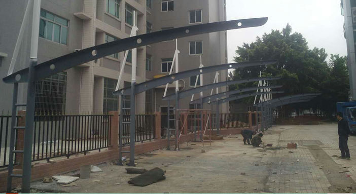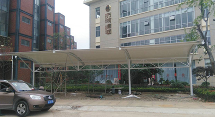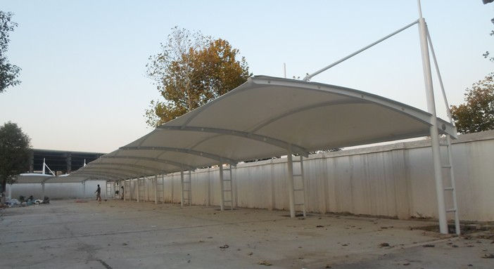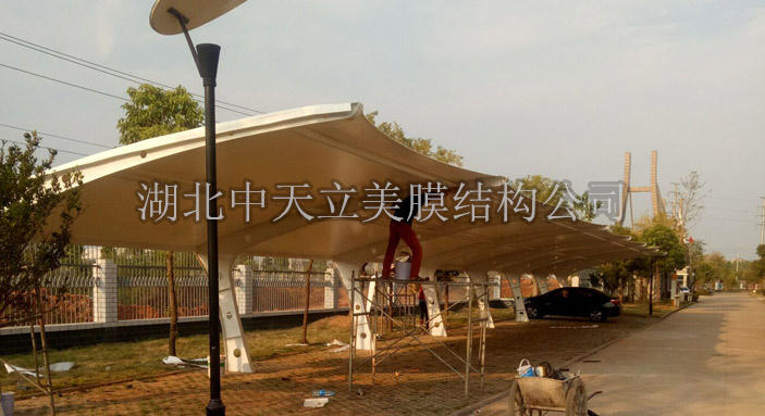 盤龍城卓爾社區(qū)T型圓管膜結(jié)構(gòu)車棚,本項(xiàng)目采用前軟邊后硬邊張拉形式;結(jié)構(gòu)由立柱、拉桿、挑梁、橫桿構(gòu)成,其挑梁和中間橫桿采用弧型圓管挑梁形式,美觀而不積水且抗負(fù)荷能力強(qiáng);膜材采用PVDF白色車棚專用建筑膜材,15年質(zhì)保,整體結(jié)構(gòu)美觀實(shí)用,經(jīng)濟(jì)牢固,臻至完美。