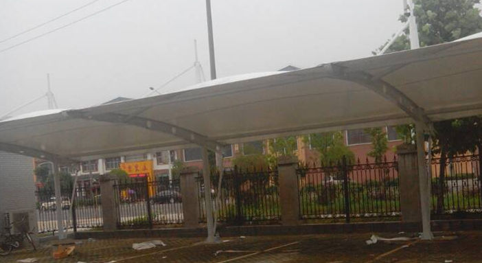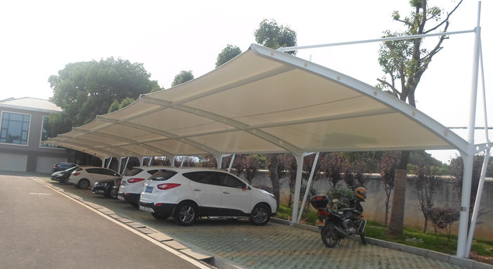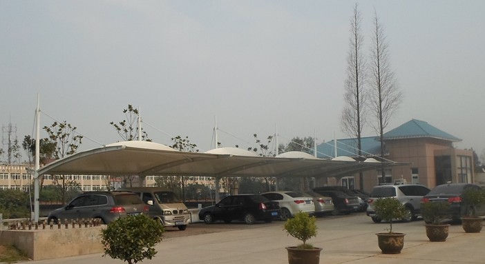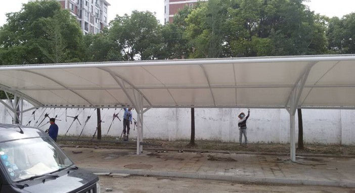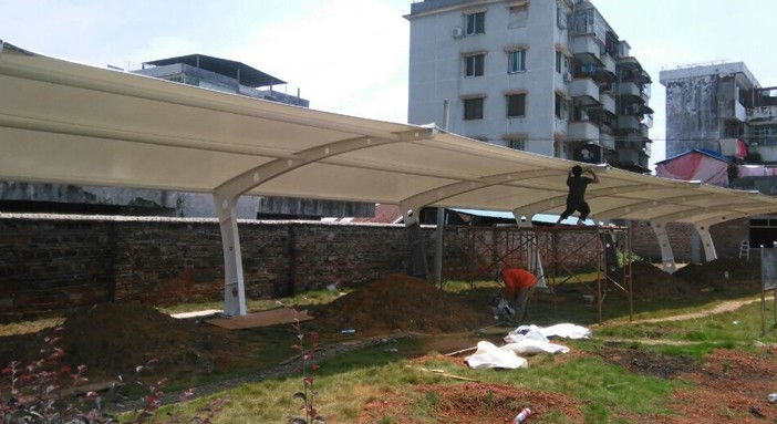 ?韶關(guān)始興氣象局異形鋼L型膜結(jié)構(gòu)停車棚,本項(xiàng)目采用前軟邊后硬邊張拉形式;結(jié)構(gòu)由立柱、拉桿、挑梁、橫桿構(gòu)成,其挑梁和中間橫桿一般采用異形鋼挑梁形式,美觀而不積水且抗負(fù)荷能力強(qiáng);膜材采用ZZF白色建筑膜材,15年質(zhì)保,整體結(jié)構(gòu)美觀實(shí)用,經(jīng)濟(jì)牢固,臻至完美。