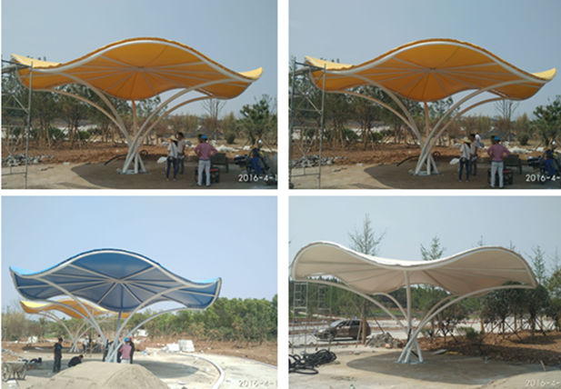 荊門市千佛洞植物園一期二標(biāo)園林景觀膜結(jié)構(gòu)工程,該項(xiàng)目結(jié)構(gòu)以荷葉的外形為基本參照設(shè)計(jì),全弧管結(jié)構(gòu)拼裝,做工精細(xì),整體流線型的外形和建筑膜材全硬邊式張拉給人以剛?cè)嶂?,為了豐富其視角效果,我們采用了彩色建筑膜以示渲染,作為公園的休閑景觀,既給人以納涼之處,又給整體環(huán)境以時(shí)尚現(xiàn)代之美。此類結(jié)構(gòu)被廣泛應(yīng)用于公園、江河湖畔、廣場(chǎng)、景區(qū)等。