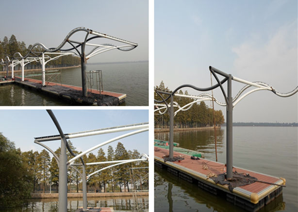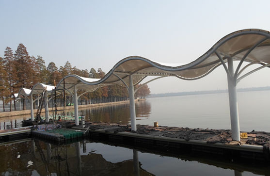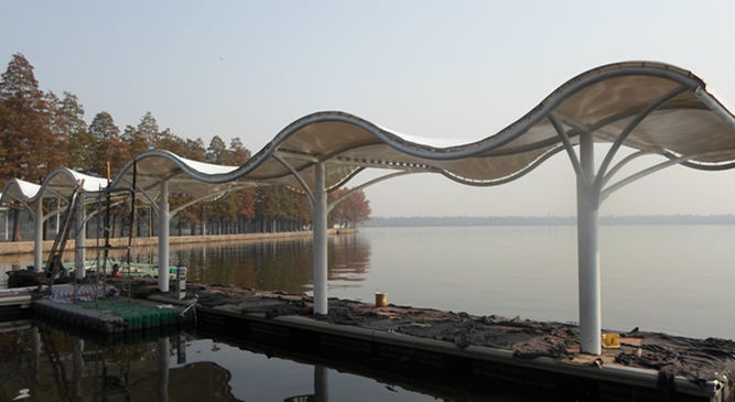 武漢東湖執(zhí)法艇碼頭景觀膜結(jié)構(gòu),該項(xiàng)目結(jié)構(gòu)為S型景觀功能性膜結(jié)構(gòu),也為波浪型結(jié)構(gòu),其立柱可放中間或者是兩側(cè),根據(jù)功能的需要,多為弧管連接,展現(xiàn)其優(yōu)美的線條感,通常在出入口、通道連廊、車站碼頭或者公園、廣場(chǎng)等地方運(yùn)用的極為廣泛。