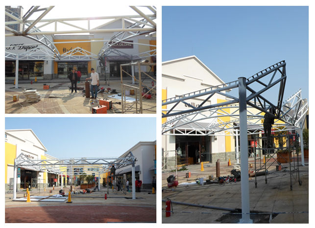 圖1 百聯(lián)奧特萊斯促銷(xiāo)臺(tái)景觀膜結(jié)構(gòu)鋼結(jié)構(gòu)現(xiàn)場(chǎng)施工圖