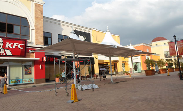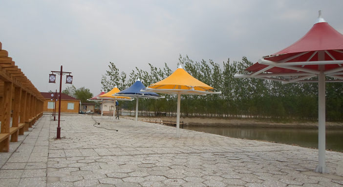 開工時(shí)間:2013年10月 查看詳情該項(xiàng)目為永久式景觀遮陽傘,其結(jié)構(gòu)為內(nèi)撐式冒頂膜結(jié)構(gòu),單帽單立柱支撐,該項(xiàng)目每個(gè)都為單個(gè)帽頂形式,pvdf建筑膜材裁剪為整張?jiān)O(shè)計(jì)張拉,對(duì)施工工藝、精度要求高,這種結(jié)構(gòu)是很多景觀遮陽項(xiàng)目的選擇,其尺寸不受限制,可大可小,可單冒頂,也可無限連帽,為了結(jié)構(gòu)的完美,冒頂裝飾可根據(jù)現(xiàn)場(chǎng)環(huán)境和結(jié)構(gòu)需要設(shè)計(jì),該冒...