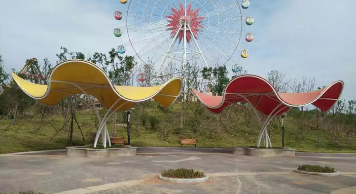 該項(xiàng)目結(jié)構(gòu)以荷葉的外形為基本參照設(shè)計(jì),全弧管結(jié)構(gòu)拼裝,做工精細(xì),整體流線型的外形和建筑膜材全硬邊式張拉給人以剛?cè)嶂?,為了豐富其視角效果,我們采用了彩色建筑膜以示渲染,作為公園的休閑景觀,既給人以納涼之處,又給整體環(huán)境以時(shí)尚現(xiàn)代之美。此類結(jié)構(gòu)被廣泛應(yīng)用于公園、江河湖畔、廣場(chǎng)、景區(qū)等。