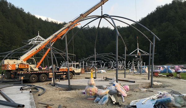 十堰櫻桃小鎮(zhèn)親子游樂園膜結(jié)構(gòu)選擇與湖北中天立美公司合作游樂園頂棚膜結(jié)構(gòu)項目!本次合作游樂園頂棚膜結(jié)構(gòu)項目合作面積達(dá)1250平方,一共要做六個造型各異的膜結(jié)構(gòu)頂棚。下面中天立美小編就去十堰親子游樂園現(xiàn)場去看看工程進(jìn)度,為工程人員施工現(xiàn)場情況做個簡單的現(xiàn)場介紹。
